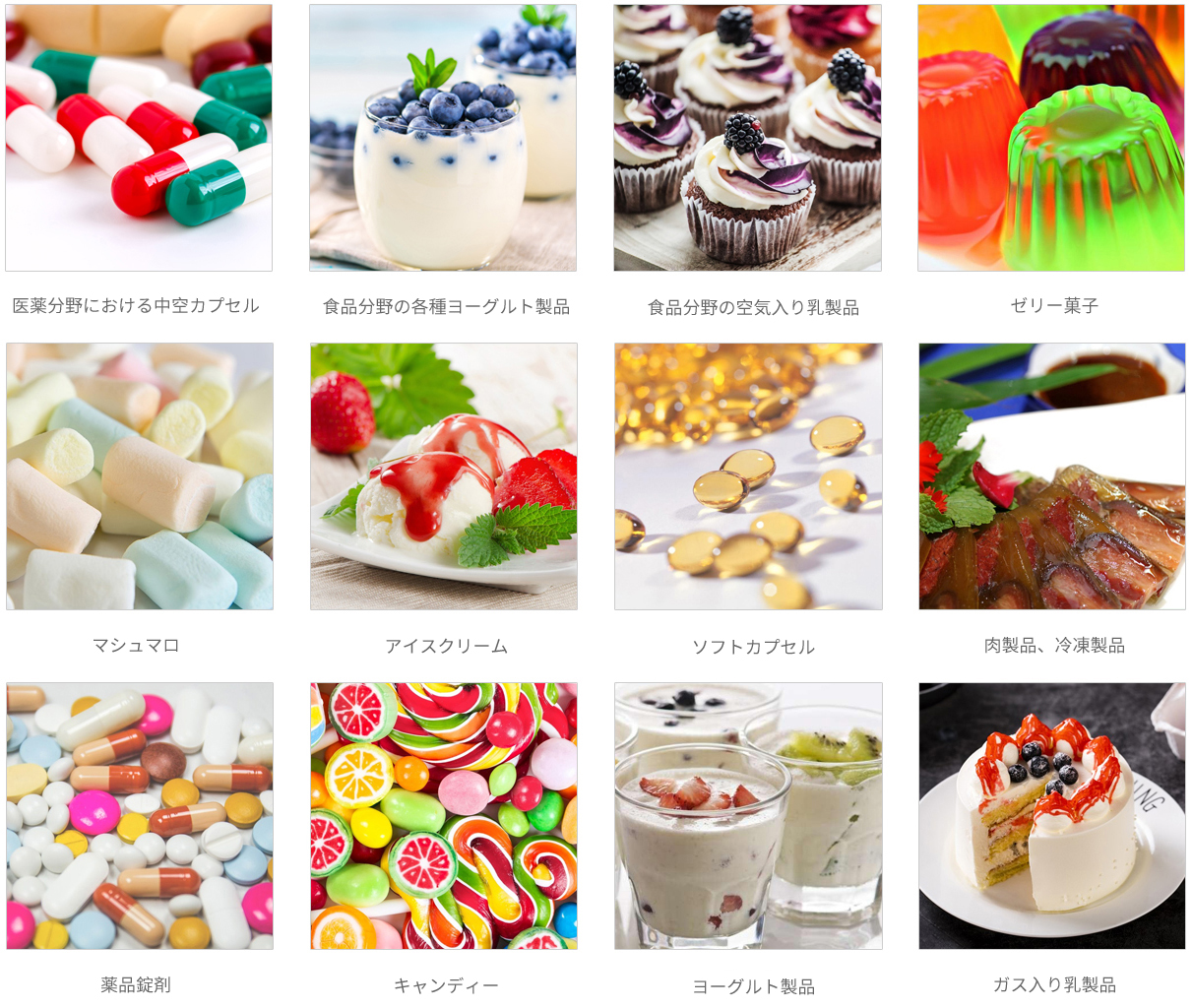 ゼラチンはキャンディの大切なパートナーです。優れた発泡性、乳化性の接着性を持ち、同時にその特有の熱可逆性はキャンディの分野に広く応用できるようにした。